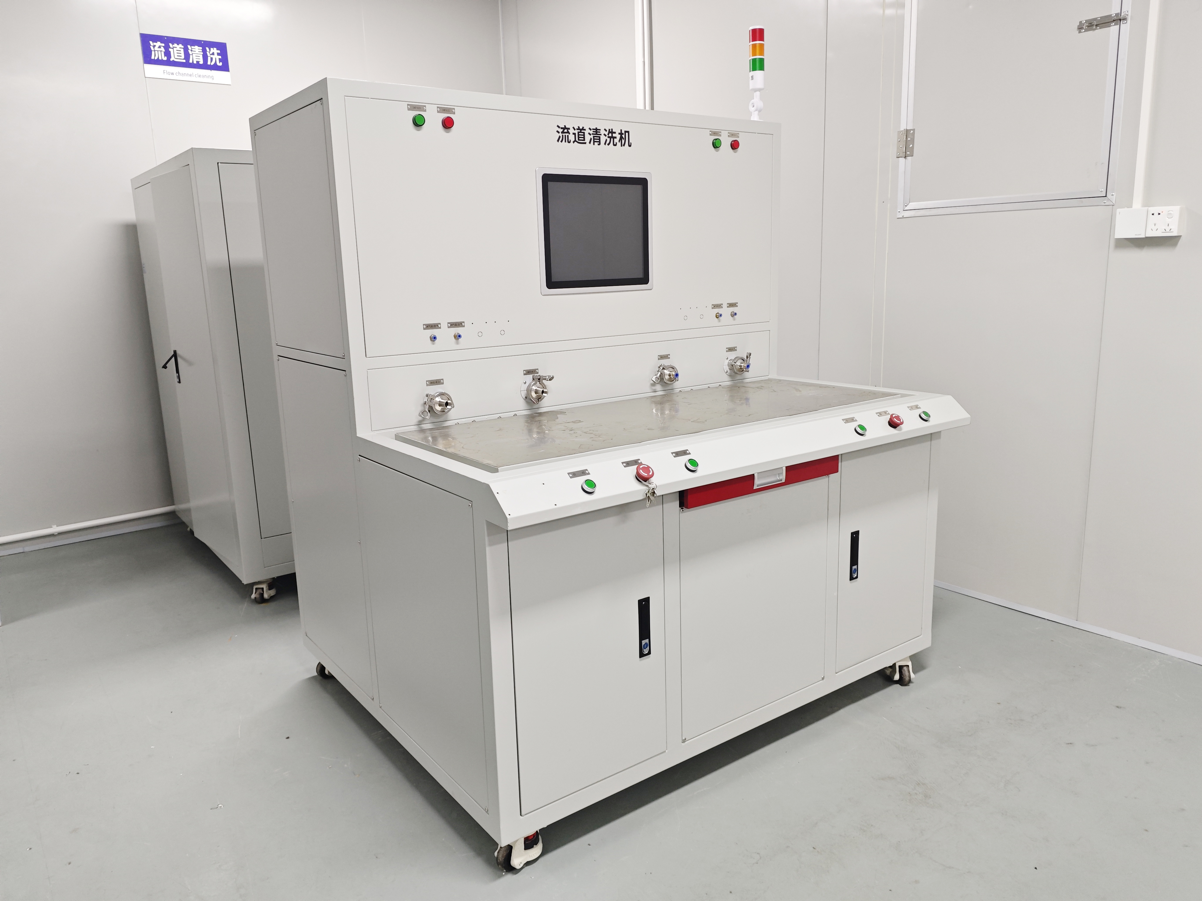 流道清洗试验机由控制部分、清洗机柜二个部分组成,能够为液冷板、管件、接头等液冷组件进行试验,试验介质为清水 ,经过变频电动液压增压泵增压,充入验工件以达到试验所需压力、流量,对工件进行整体或局部的液压试验 ,通过观察试验产品是否有压降来判断产品合格与否。乐瑞流道清洗机整体底部带万向脚轮,方便机柜的移动和固定,流道清洗试验机采用高压离心泵水压系统做动力源,提高了稳定性和可靠性,同时加压速度及控制精度都有进一步的提高。